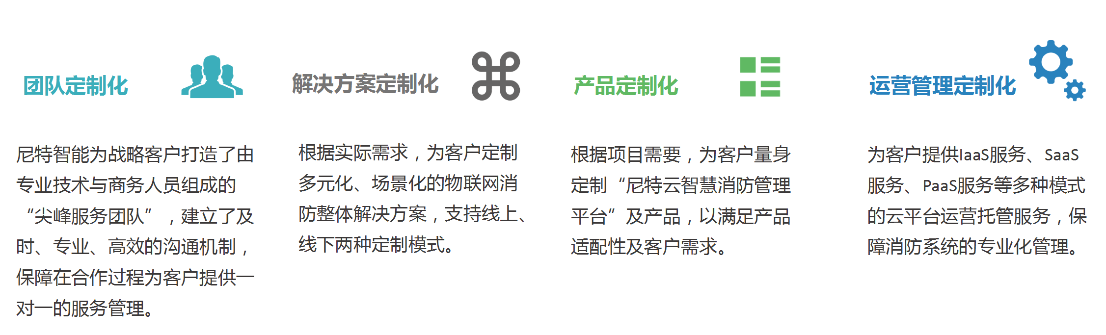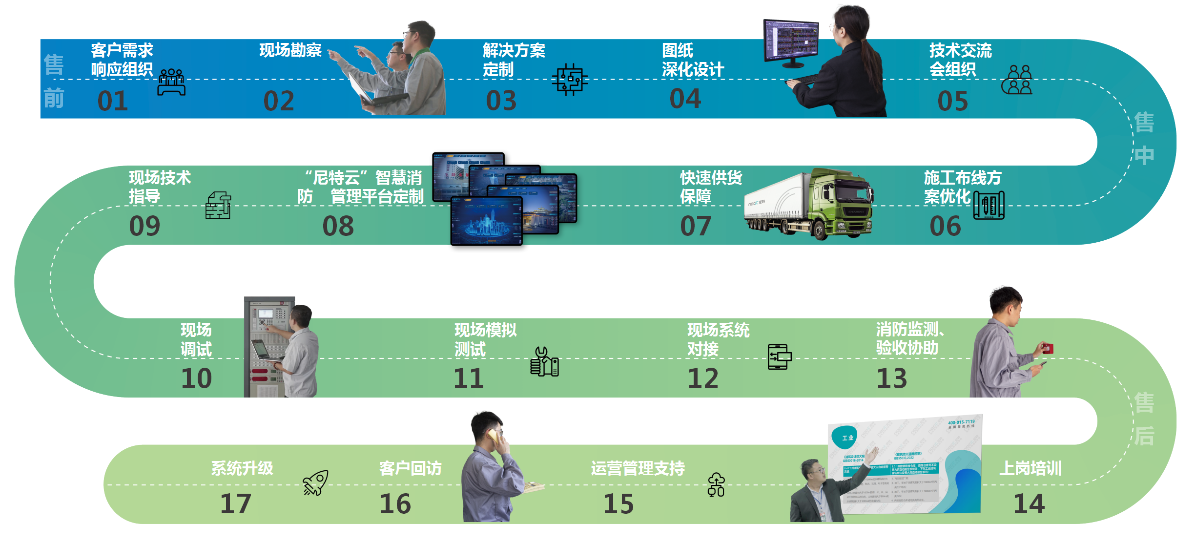 尼特智能將設(shè)備銷售過程轉(zhuǎn)變?yōu)楦采w項目全生命周期的服務模式,涵蓋方案制定、圖紙優(yōu)化、調(diào)試驗收、上崗培訓等基礎(chǔ)內(nèi)容,同時推出以智慧消防云平臺為載體的定制化開發(fā)、系統(tǒng)維護與升級、運營管理等后續(xù)服務,讓服務更加系統(tǒng)全面。