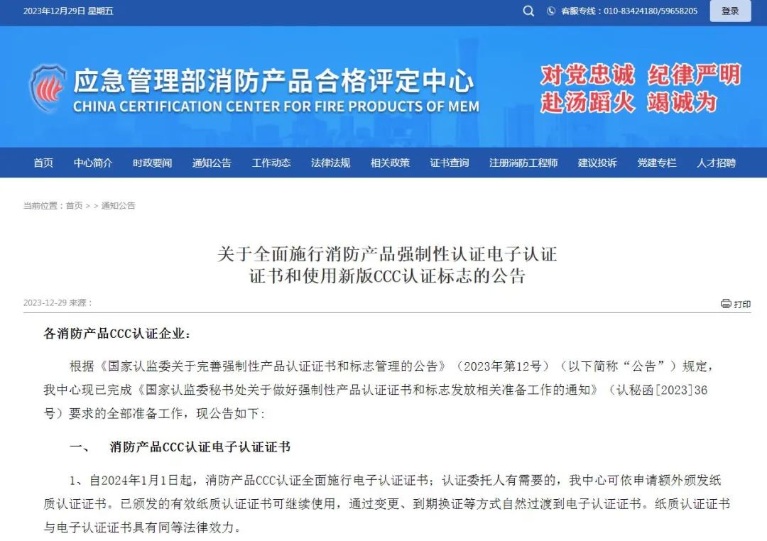 根據(jù)《國(guó)家認(rèn)監(jiān)委關(guān)于完善強(qiáng)制性產(chǎn)品認(rèn)證證書(shū)和標(biāo)志管理的公告》(2023年第12號(hào))(以下簡(jiǎn)稱“公告”)規(guī)定,我中心現(xiàn)已完成《國(guó)家認(rèn)監(jiān)委秘書(shū)處關(guān)于做好強(qiáng)制性產(chǎn)品認(rèn)證證書(shū)和標(biāo)志發(fā)放相關(guān)準(zhǔn)備工作的通知》(認(rèn)秘函[2023]36號(hào))要求的全部準(zhǔn)備工作,現(xiàn)公告如下:一、消防產(chǎn)品CCC認(rèn)證電子認(rèn)證證書(shū)
