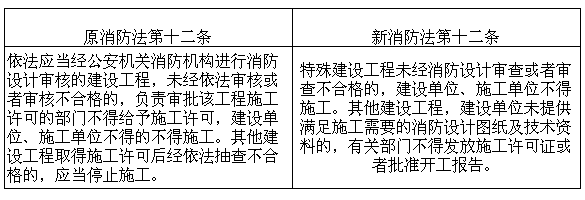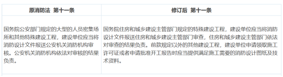 解讀: 原消防法的規(guī)定主要是體現(xiàn)了公安部消防機(jī)關(guān)的具體職能,新法規(guī)則體現(xiàn)了機(jī)構(gòu)職能的轉(zhuǎn)變,特殊建設(shè)工程審查由住建部負(fù)責(zé)。同時(shí),雖然新法規(guī)取消了對(duì)“設(shè)計(jì)備案”的要求,但仍需提供“消防設(shè)計(jì)圖紙及技術(shù)資料”,過去是先取證再備案,現(xiàn)在是先提交再取證,對(duì)于消防工作本身,不僅沒有弱化,反而更強(qiáng)化。