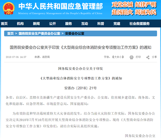 國(guó)務(wù)院安委會(huì)辦公室于2018年印發(fā)《大型商業(yè)綜合體消防安全專(zhuān)項(xiàng)整治工作方案》,將商業(yè)綜合體的消防工作納入重點(diǎn)工作,要做到有效防治和堅(jiān)決遏制商業(yè)綜合體重特大火災(zāi)事故發(fā)生,保障人民生命財(cái)產(chǎn)安全。