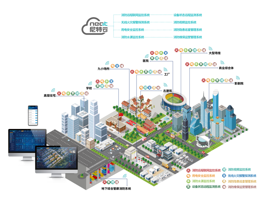 尼特基于物聯(lián)網(wǎng)、4G/5G、大數(shù)據(jù)、云計(jì)算技術(shù),通過(guò)安裝用戶傳輸裝置、獨(dú)立式火災(zāi)報(bào)警探測(cè)器、消防管網(wǎng)壓力探測(cè)器、智慧用電、設(shè)備狀態(tài)監(jiān)控器等前端感知設(shè)備為高層建筑建立完整的智慧消防解決方案,實(shí)現(xiàn)在線監(jiān)測(cè)、主動(dòng)預(yù)警、應(yīng)急報(bào)警。利用尼特云智慧消防管理平臺(tái),加強(qiáng)對(duì)建筑內(nèi)消防設(shè)施系統(tǒng)的動(dòng)態(tài)監(jiān)管,統(tǒng)計(jì)消防設(shè)施運(yùn)行數(shù)據(jù),實(shí)現(xiàn)數(shù)據(jù)可視化,進(jìn)行量化分析、評(píng)估和預(yù)警,為大型商業(yè)綜合體管理層指揮決策提供數(shù)據(jù)支持。