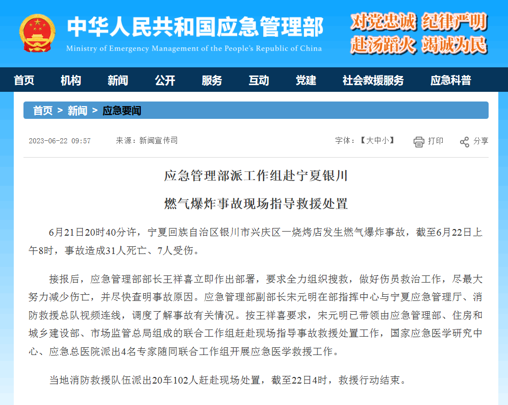6月21日20時40分許,寧夏回族自治區(qū)銀川市興慶區(qū)富洋燒烤店發(fā)生燃氣爆炸事故,截至6月22日8時,事故造成31人死亡、7人受傷。