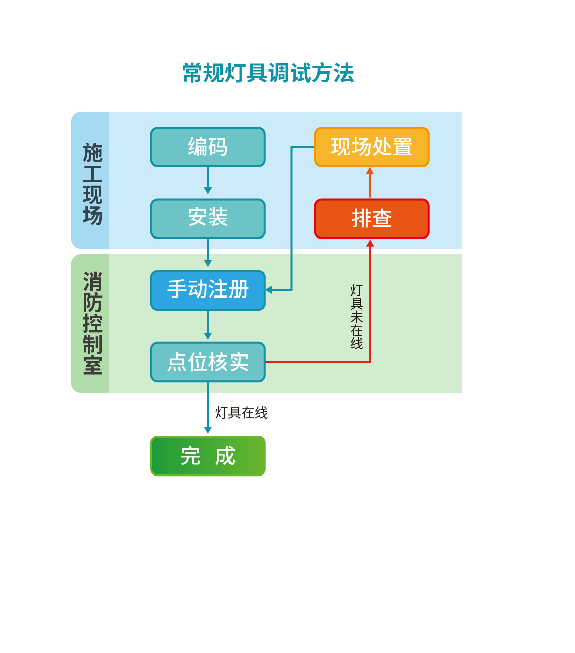 在應(yīng)急疏散燈具產(chǎn)品用量大且分布廣泛的大宗場(chǎng)所,需要在現(xiàn)場(chǎng)完成每個(gè)燈具的編碼及安裝后,從消防控制室內(nèi)的應(yīng)急照明控制器進(jìn)行燈具注冊(cè)登記,核實(shí)點(diǎn)位情況,當(dāng)出現(xiàn)燈具未在線情況時(shí),還需回到安裝現(xiàn)場(chǎng),進(jìn)行拆卸調(diào)試,再次通過(guò)控制器復(fù)位確定燈具在線狀態(tài)。
