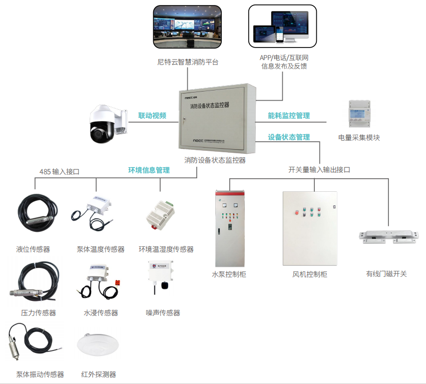 在國(guó)網(wǎng)供電的設(shè)備機(jī)房、風(fēng)機(jī)房、水泵房、電梯機(jī)房、配電房等場(chǎng)所安裝尼特消防設(shè)備狀態(tài)監(jiān)控器,實(shí)時(shí)監(jiān)測(cè)消防設(shè)備的電源、運(yùn)行、故障、手自動(dòng)狀態(tài)和控制設(shè)備啟停,同時(shí)可以對(duì)環(huán)境中溫濕度、水浸、噪聲、水泵風(fēng)機(jī)振動(dòng)、水泵表面溫度、壓力、液位等信息進(jìn)行實(shí)時(shí)探測(cè),無需安排人力進(jìn)行現(xiàn)場(chǎng)巡查,減輕了人員巡檢壓力,同時(shí)降低了項(xiàng)目管理企業(yè)運(yùn)營(yíng)的人力及能耗成本,提高了國(guó)網(wǎng)供電火災(zāi)風(fēng)險(xiǎn)應(yīng)急響應(yīng)效率。