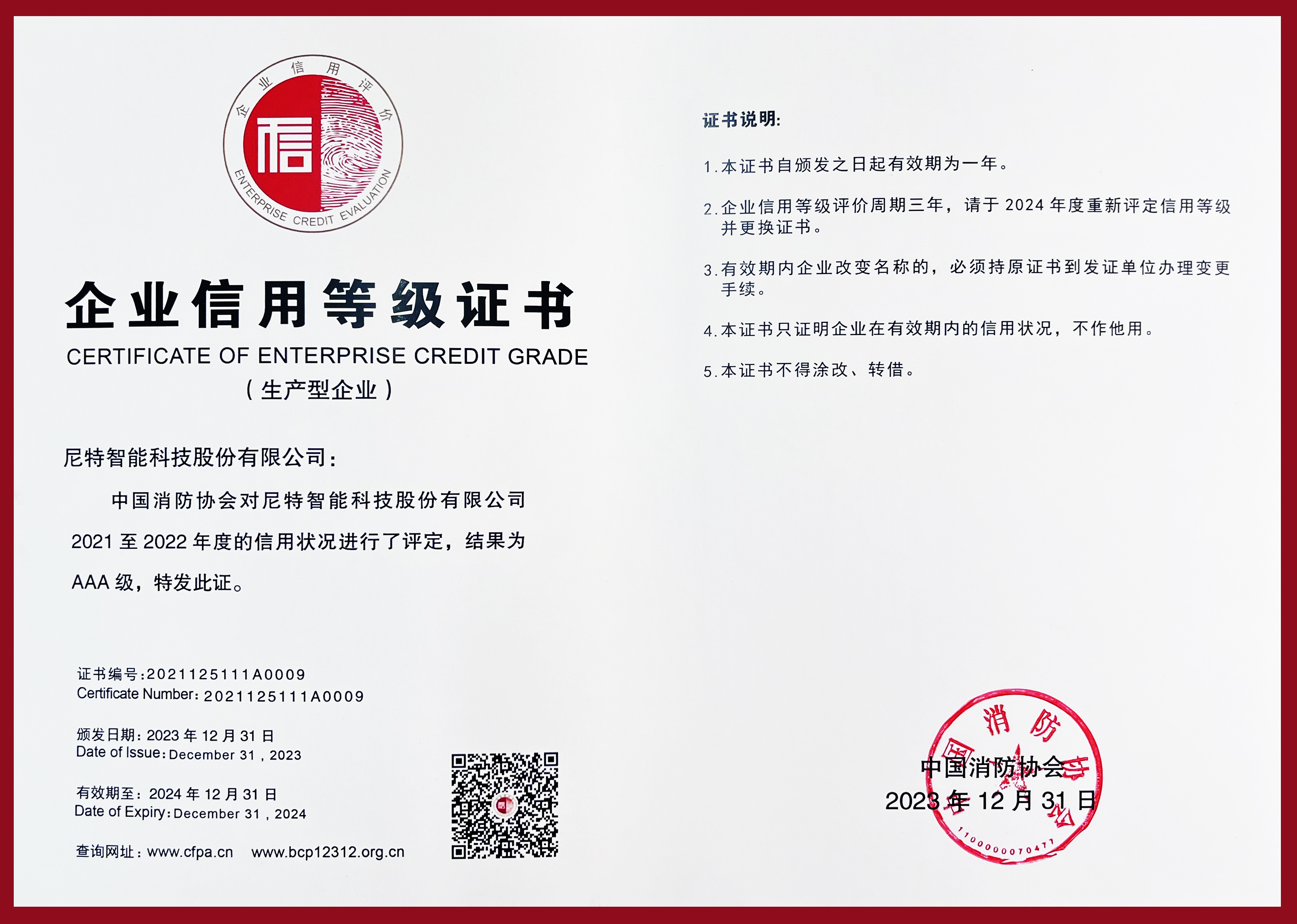 從2012年至今,尼特智能已連續(xù)12年榮獲中國消防協(xié)會頒發(fā)的“AAA級企業(yè)信用等級證書”,是消防行業(yè)權威機構對尼特智能誠信經營、誠信履約、誠信品牌的充分肯定,也是公司又一次綜合實力提升的表現。