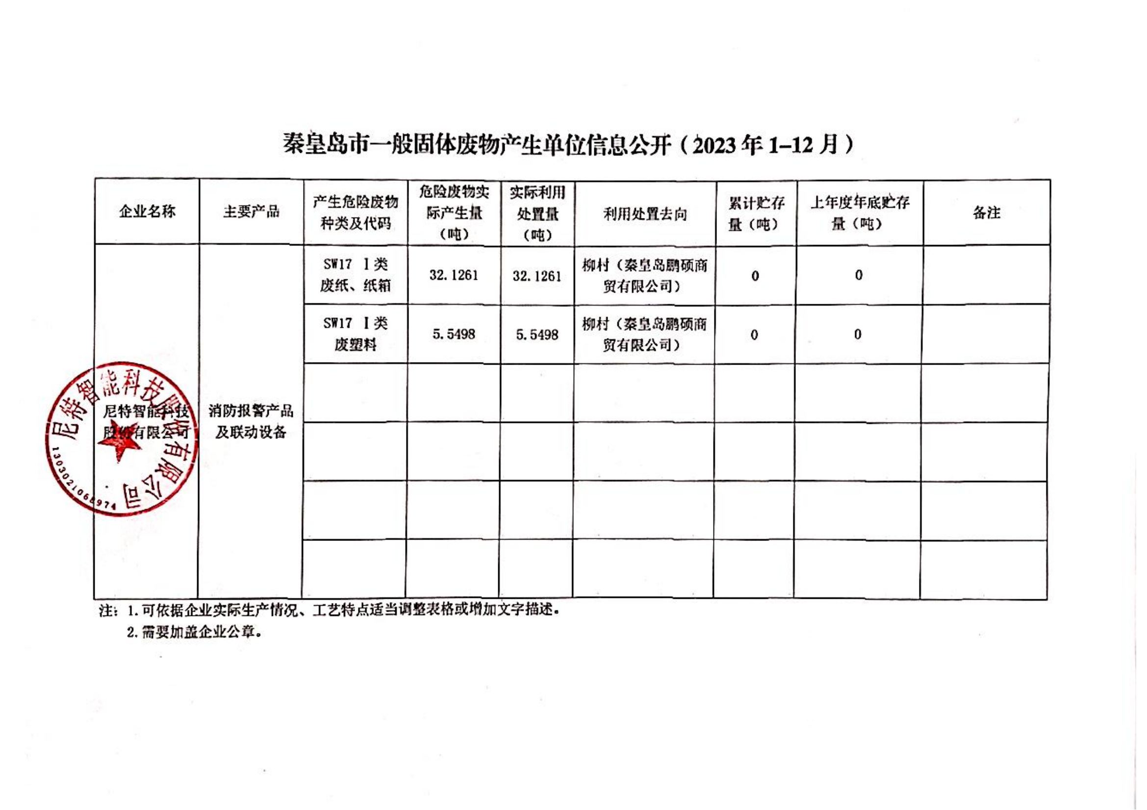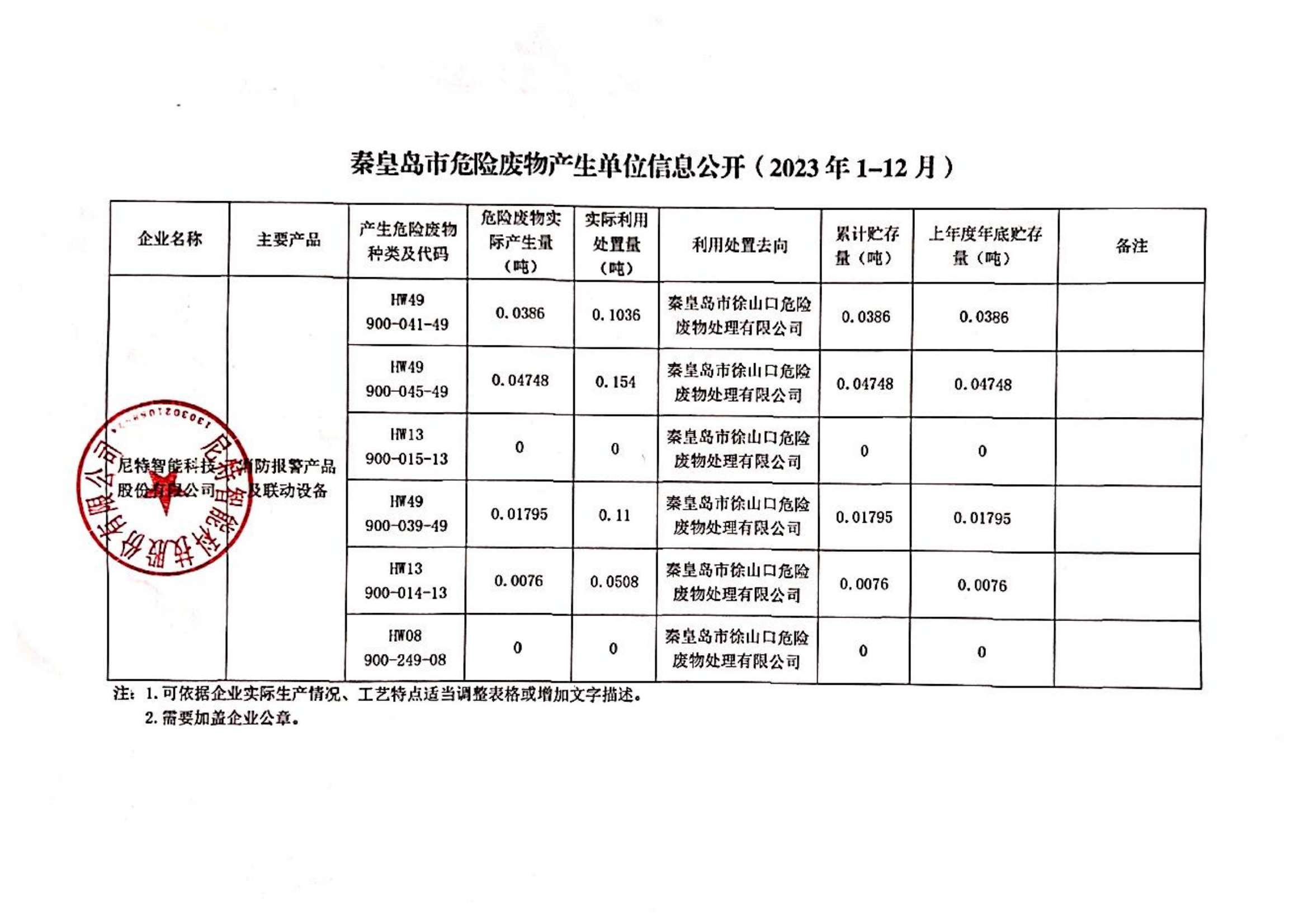 尼特智能公司2023年度一般固廢和危險廢物產(chǎn)生單位信息公開