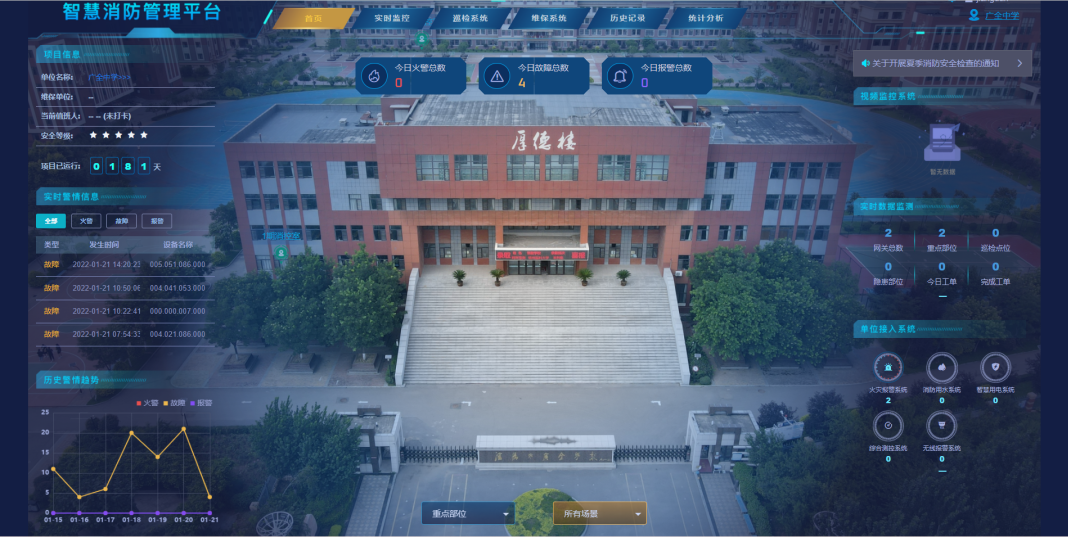 解決方案:針對學?;拘畔ⅰ⒔ㄖ畔?、重點部位信息、消防設施信息、人員信息等消防相關信息,建立尼特云智慧消防管理平臺,對各類消防設施進行實時監(jiān)測,方便清晰了解校園內每個區(qū)域的消防情況,協(xié)助決策。