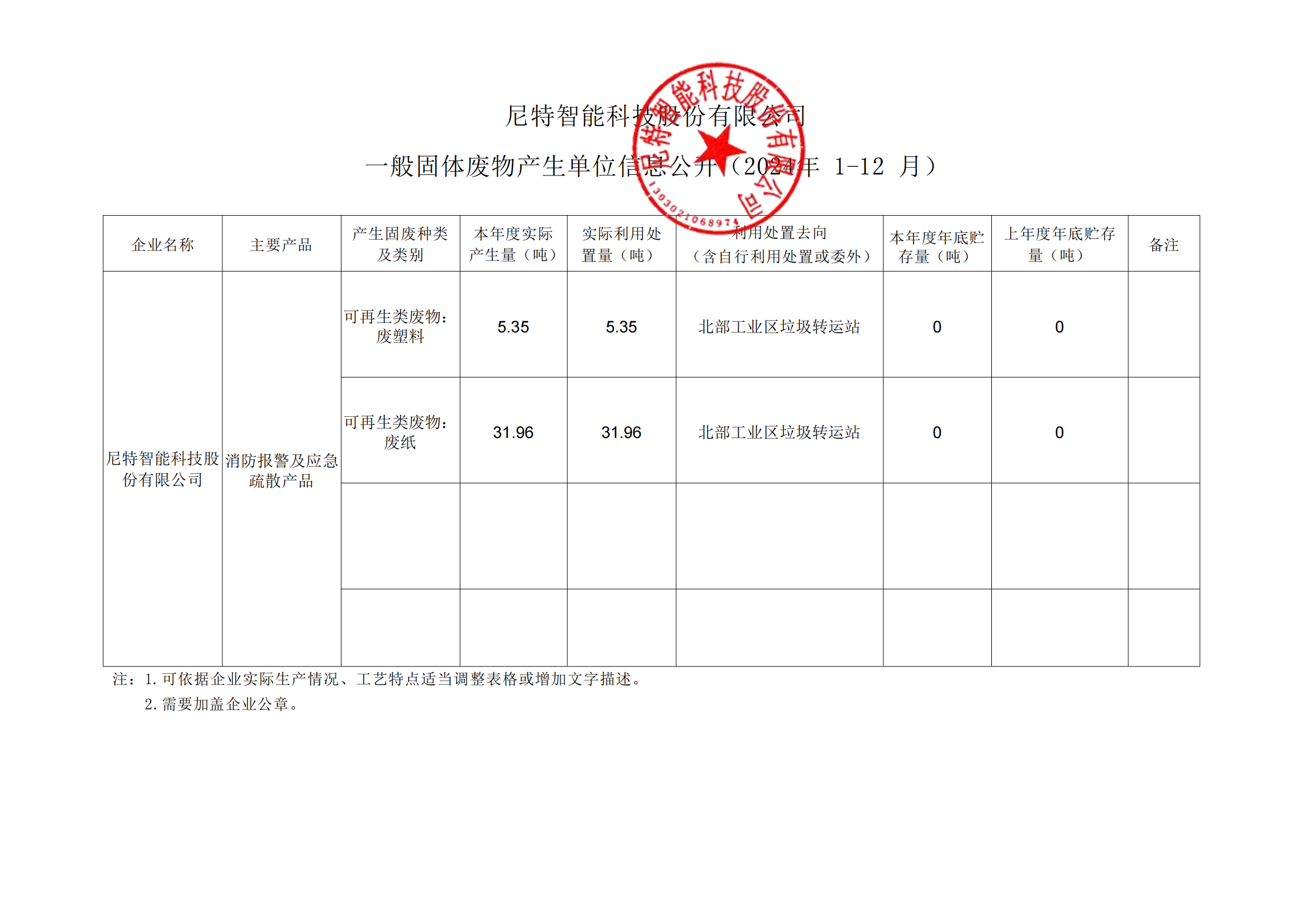 尼特智能科技股份有限公司 一般固體廢物產(chǎn)生單位信息公開(kāi)(2024年 1-12 月)