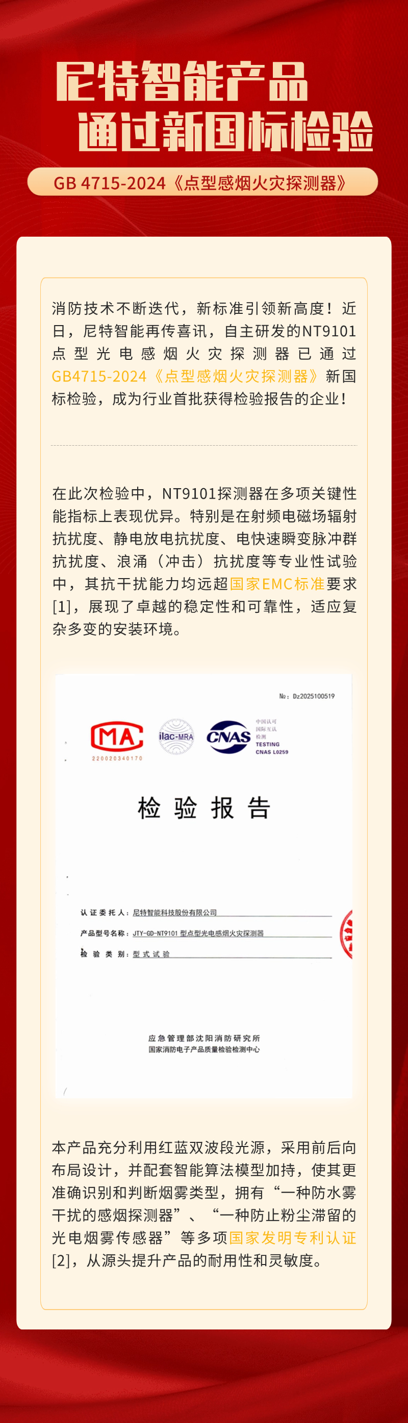注:[1]在靜電放電抗擾度試驗中,國標要求在接空氣放電8kV,正負極各10次試驗后還可正常工作,尼特可在接空氣放電8.5kV,正負極各50次試驗后保持正常工作;在電快速瞬變脈沖群抗擾度試驗中,國標要求在瞬變脈沖電壓1×(1±0.1)kV下仍可正常工作,尼特技術(shù)可在瞬變脈沖電壓1.5kV下保持正常工作;在浪涌(沖擊)抗擾度試驗中,國標要求在浪涌(沖擊)電壓1.1kV下仍可正常工作,尼特技術(shù)可在浪涌(沖擊)電壓1.5kV下保持正常工作。