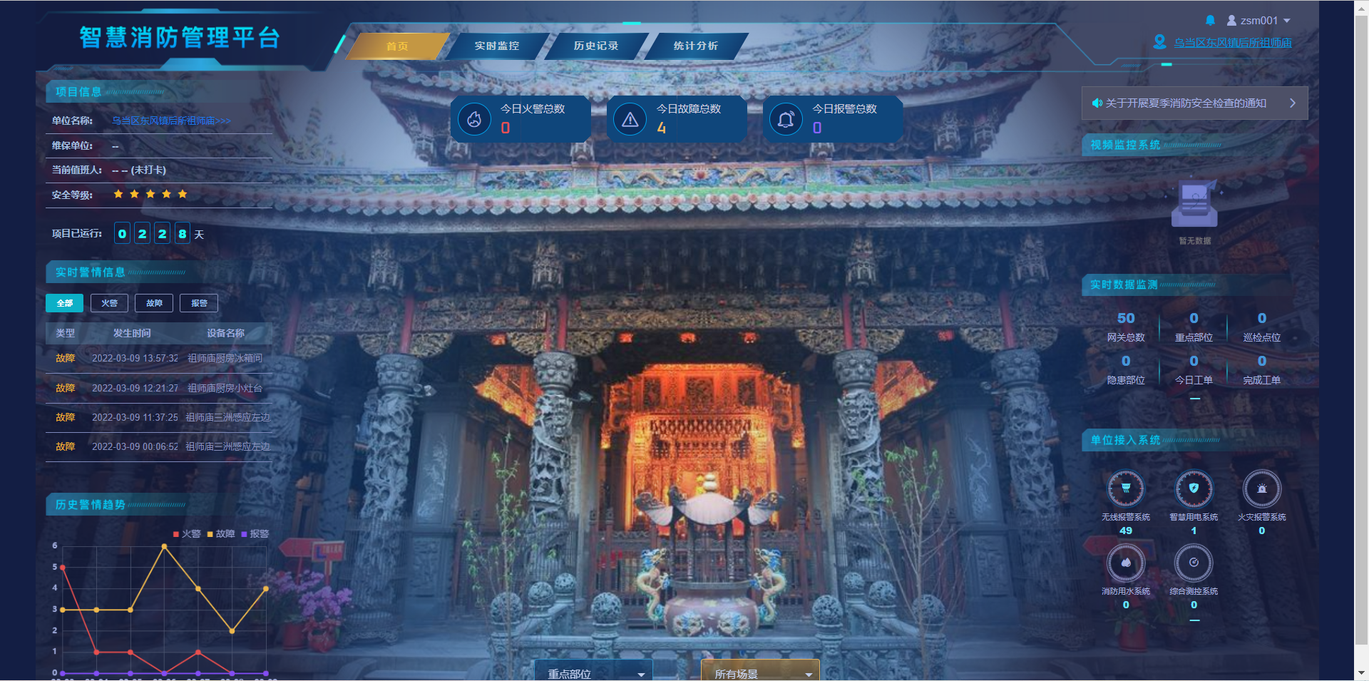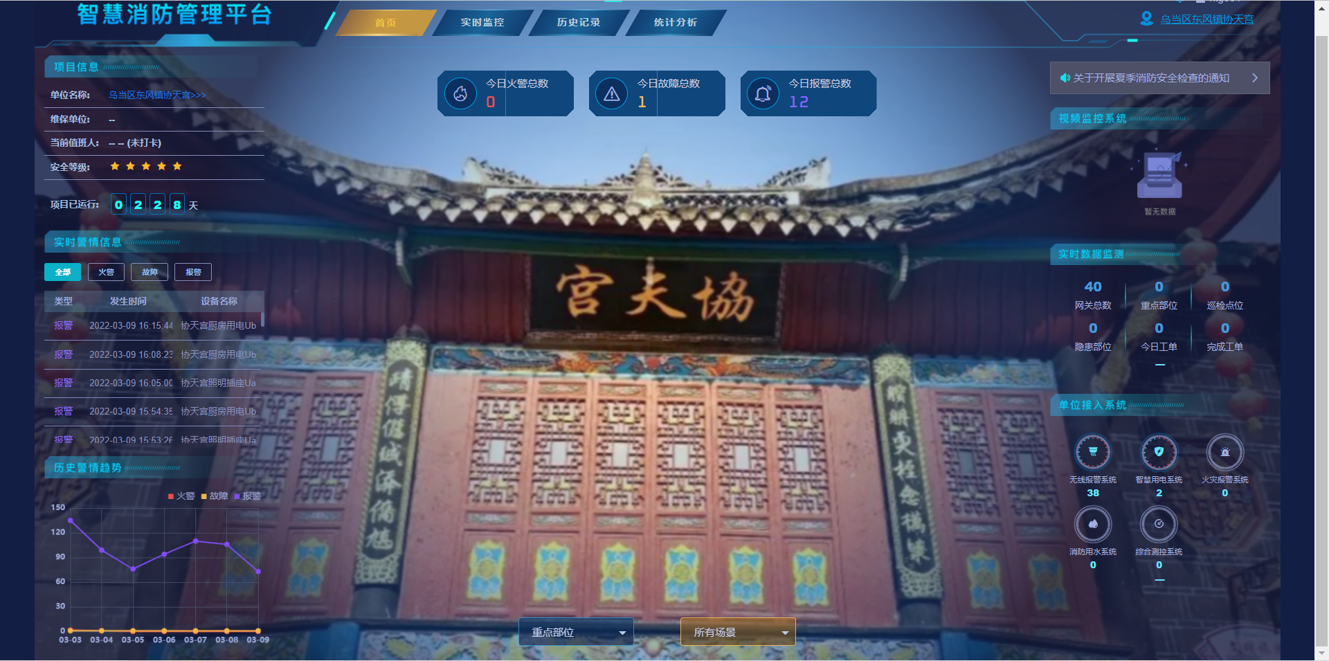 后所祖師廟、協(xié)天宮管理員可通過尼特云4.0平臺(tái)實(shí)時(shí)監(jiān)控區(qū)域消防設(shè)備、設(shè)施運(yùn)行情況,及時(shí)排查火災(zāi)隱患,改變?nèi)斯けO(jiān)管為智能監(jiān)管,大大減少了火災(zāi)安全隱患,不僅為古建筑單位節(jié)約了人力成本,更極大提高了消防安全監(jiān)管效率。