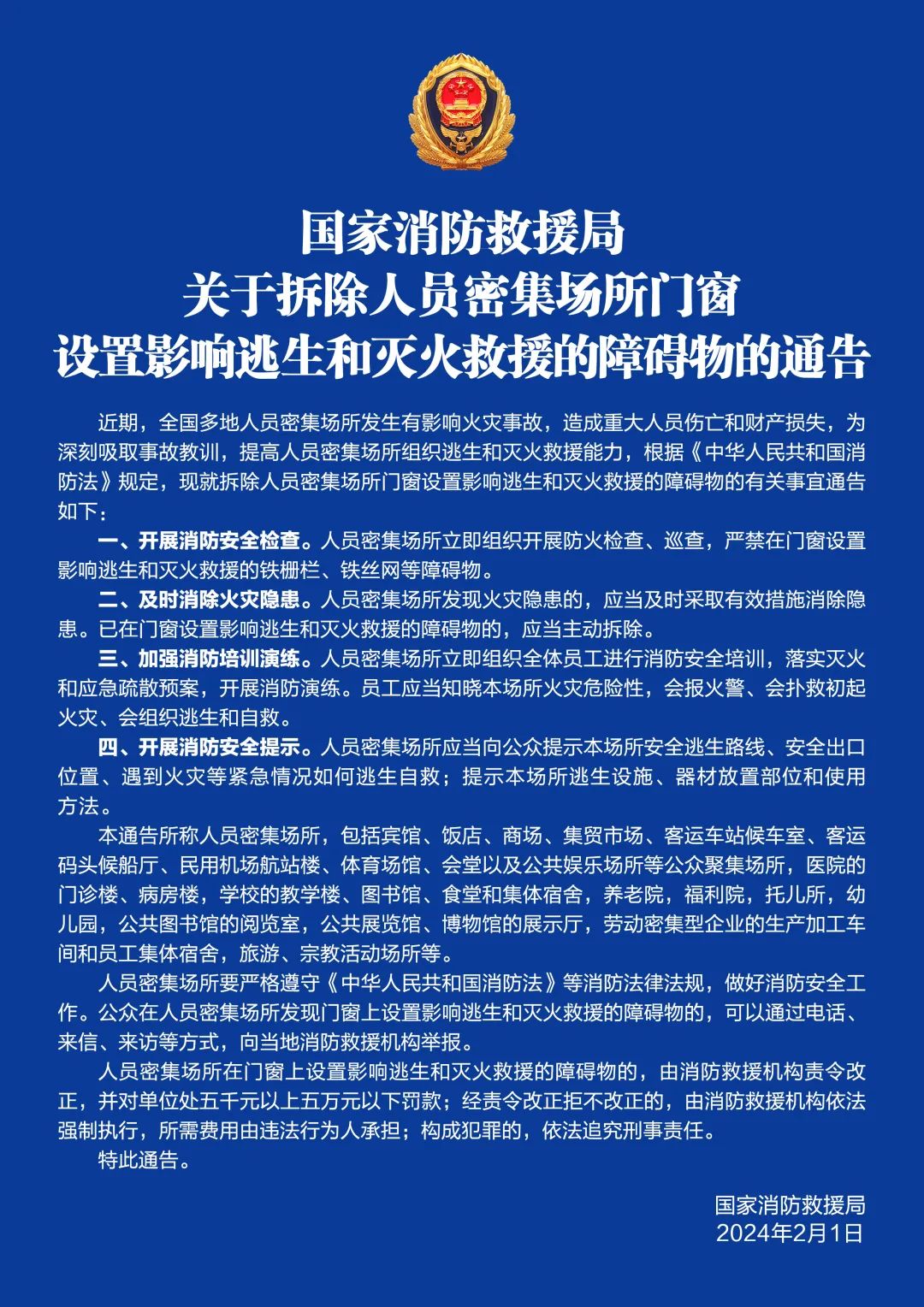 國家消防救援局關(guān)于拆除 人員密集場所門窗設(shè)置影響逃生 和滅火救援的障礙物的通告 近期,全國多地人員密集場所發(fā)生有影響火災(zāi)事故,造成重大人員傷亡和財產(chǎn)損失,為深刻吸取事故教...